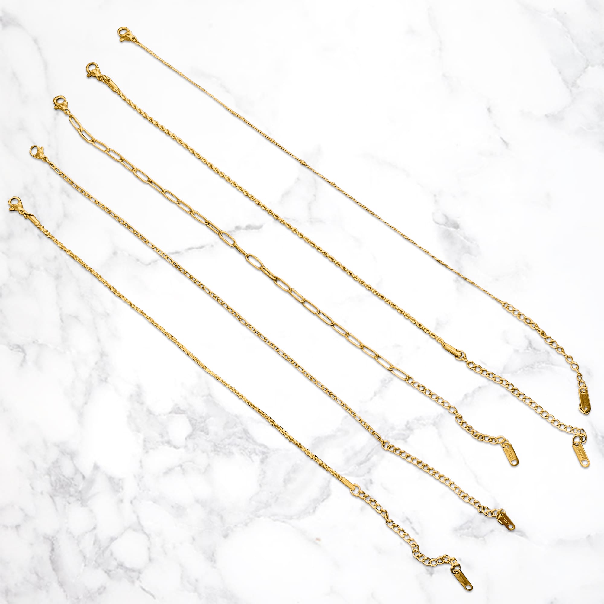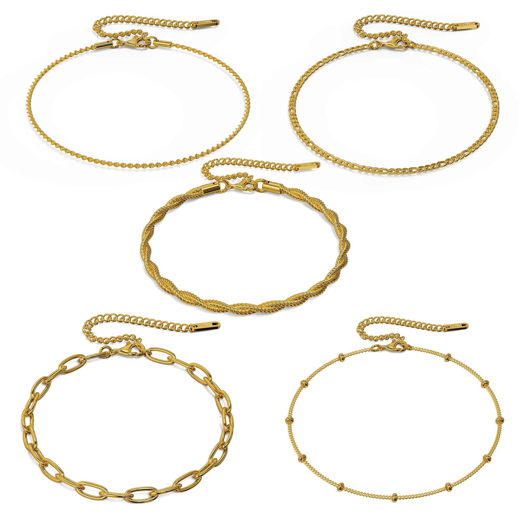 Elevate your ankle game with our exquisite Boxed 5 Piece Link Chain Anklet Set. This stunning collection features five unique anklet designs, each crafted with the finest yellow gold and featuring a sleek boxed link chain pattern. The set offers a variety of lengths and styles to suit your personal taste, allowing you to mix and match or wear them individually. Whether you’re dressing up or down, this anklets set is the perfect way to add a touch of sophistication and elegance to your look.