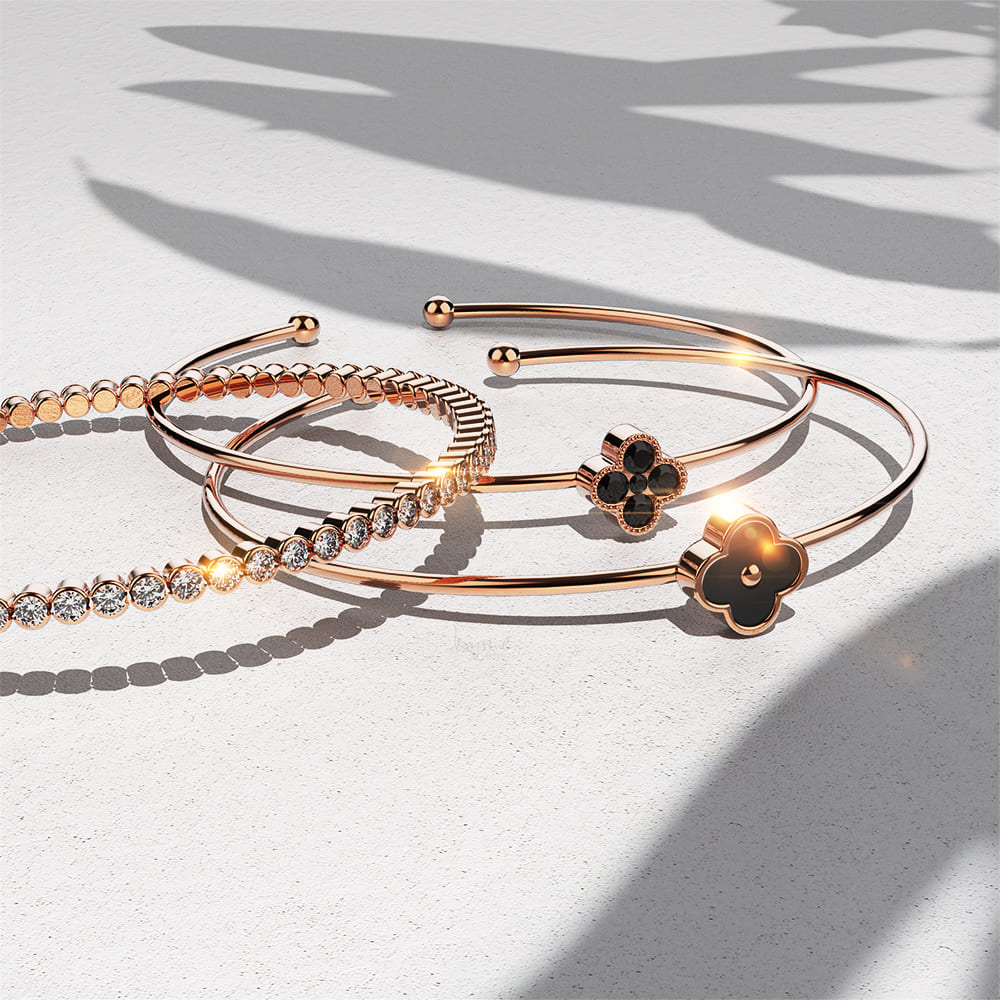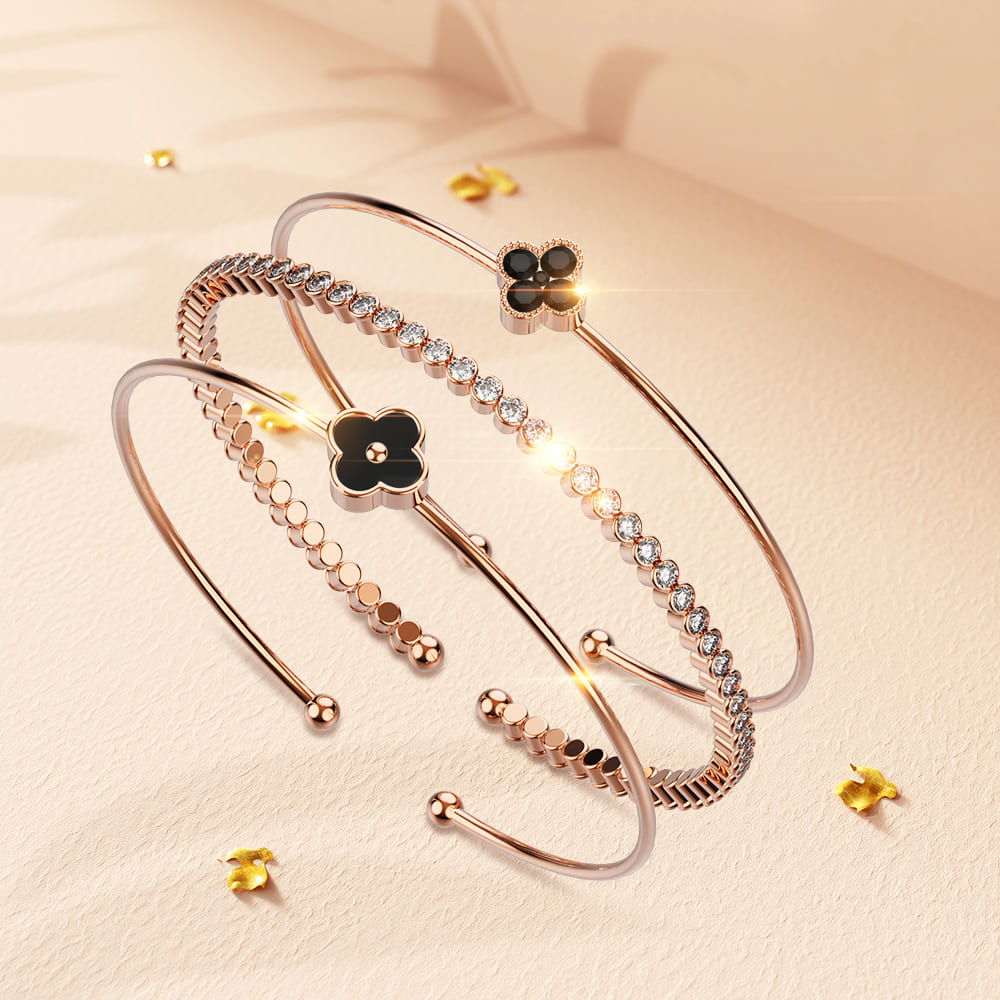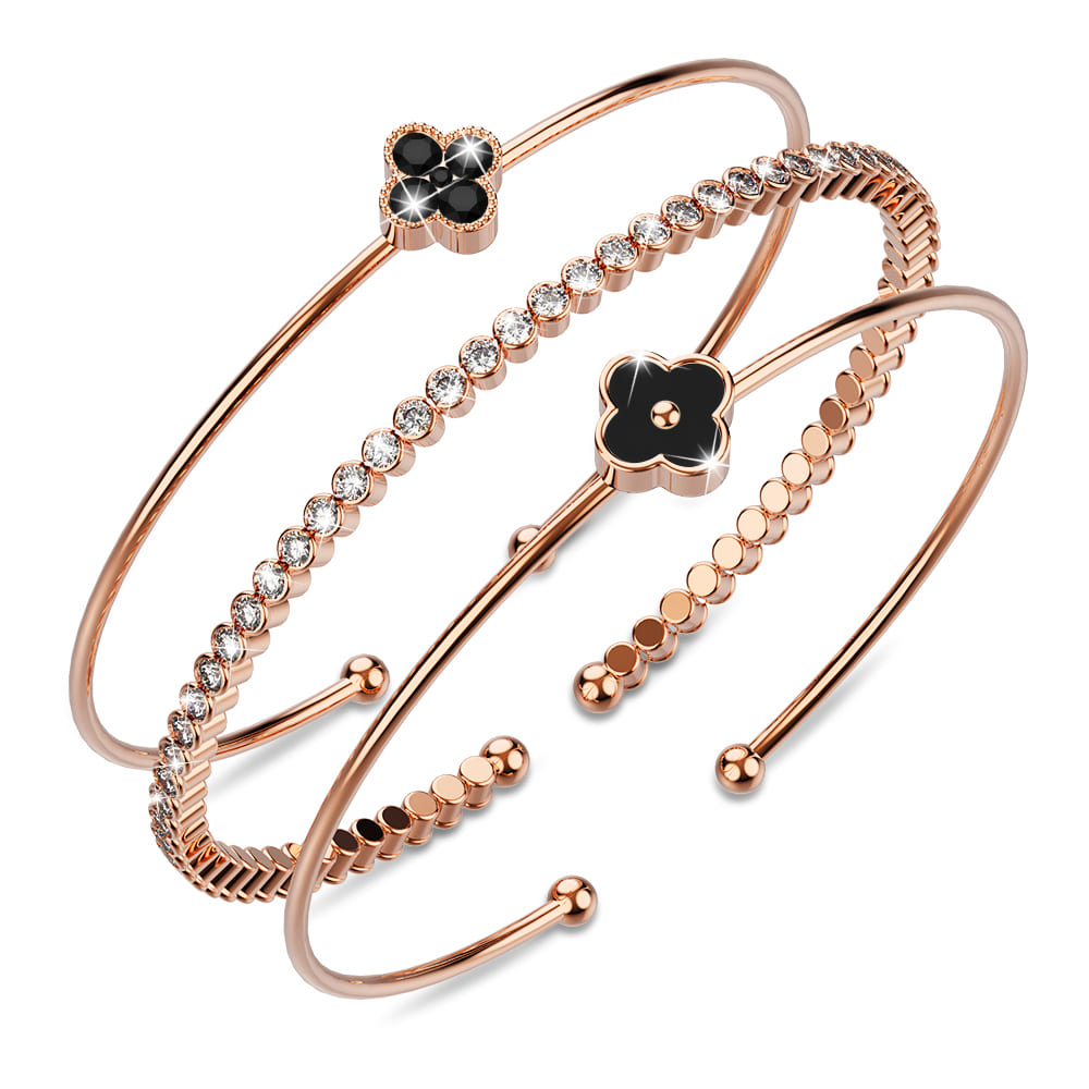 Fabulously fashionable and sleek style, this stackable bangle brings your look into the next level. This rose gold finished jewelry is delicately crafted with 4 clover design to add a sweet and charming touch and embellished with Crystals from SWAROVSKI® for a sparkly finish. A graceful & elegant beauty!