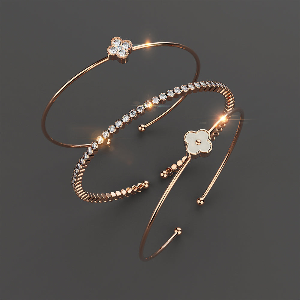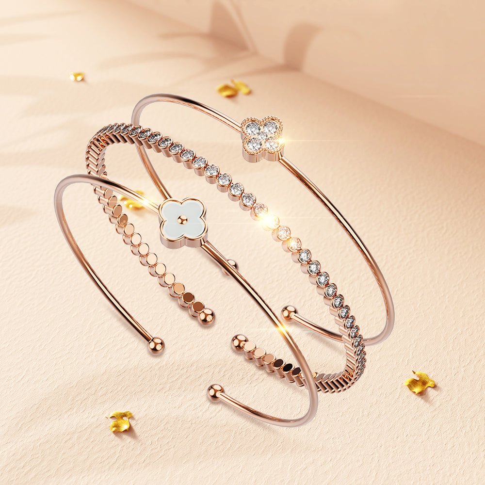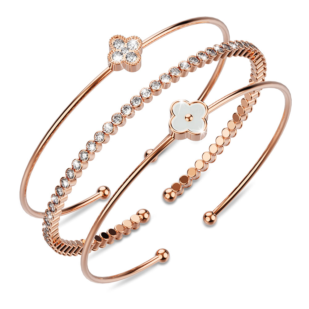 Fabulously fashionable and sleek style, this stackable bangle brings your look into the next level. This rose gold finished jewelry is delicately crafted with 4 clover design to add a sweet and charming touch and embellished with Crystals from SWAROVSKI® for a sparkly finish. A graceful & elegant beauty!