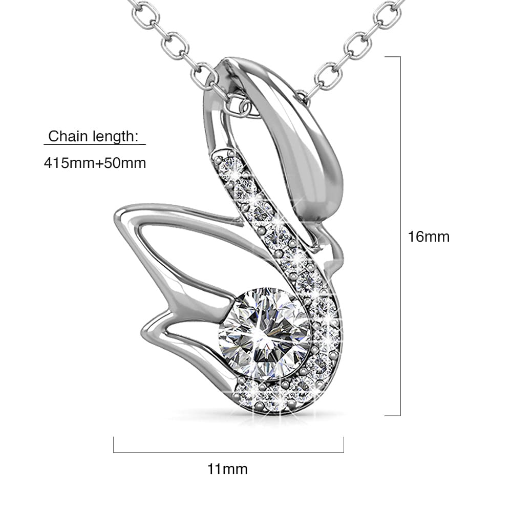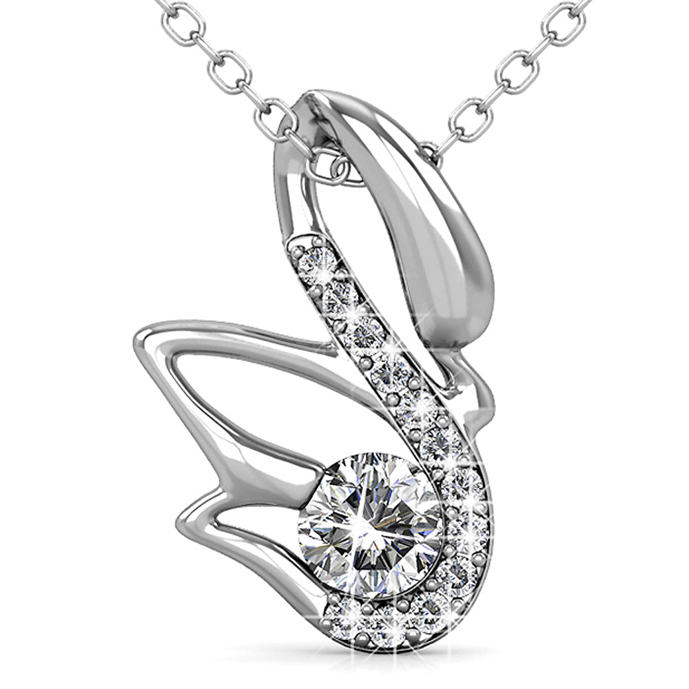 Crafted with highly polished 18K White Gold plated alloy, this unique necklace features Crystals from SWAROVSKI® The pendant is carefully fashioned into an enchanted swan design that shimmers with one round-cut crystal accompanied with multiple smaller crystals all made with SWAROVSKI® elements. This timeless & elegant SWAROVSKI® Swan piece is a must-have in your collection.