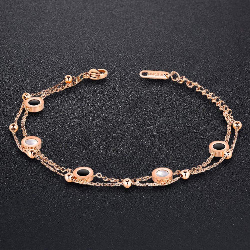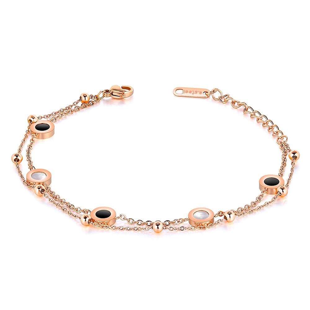 This double strand bracelet features round charms with inlaid oyster shells. It is crafted from 18ct rose gold layered stainless steel. This versatile piece is suited for all attire. Perfect for any occasions!