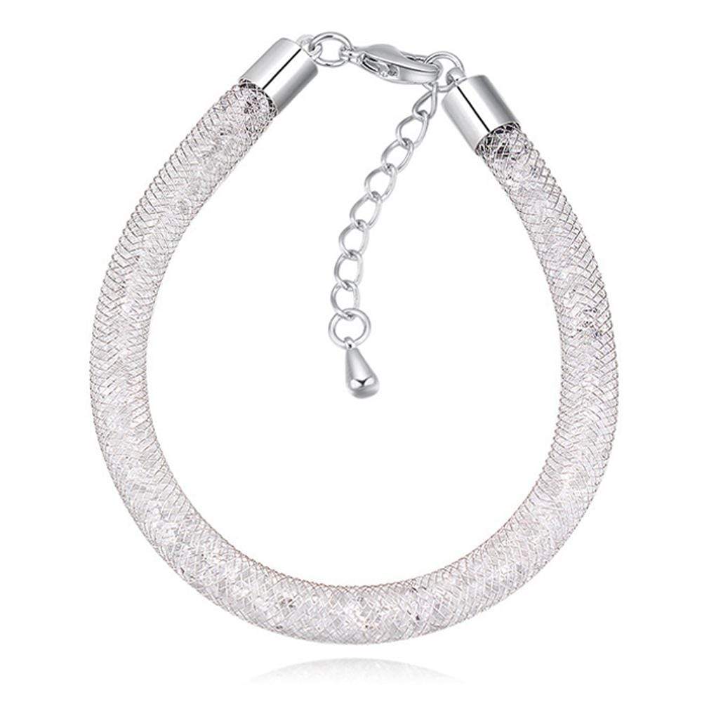 This gleaming bracelet is made to coordinate a wide assortment of outfits. Featuring brilliant clear crystals enclosed in fine mesh tube secured with an adjustable lobster claw clasp. This contemporary design bracelet is truly a unique piece that sparkles at any angle.