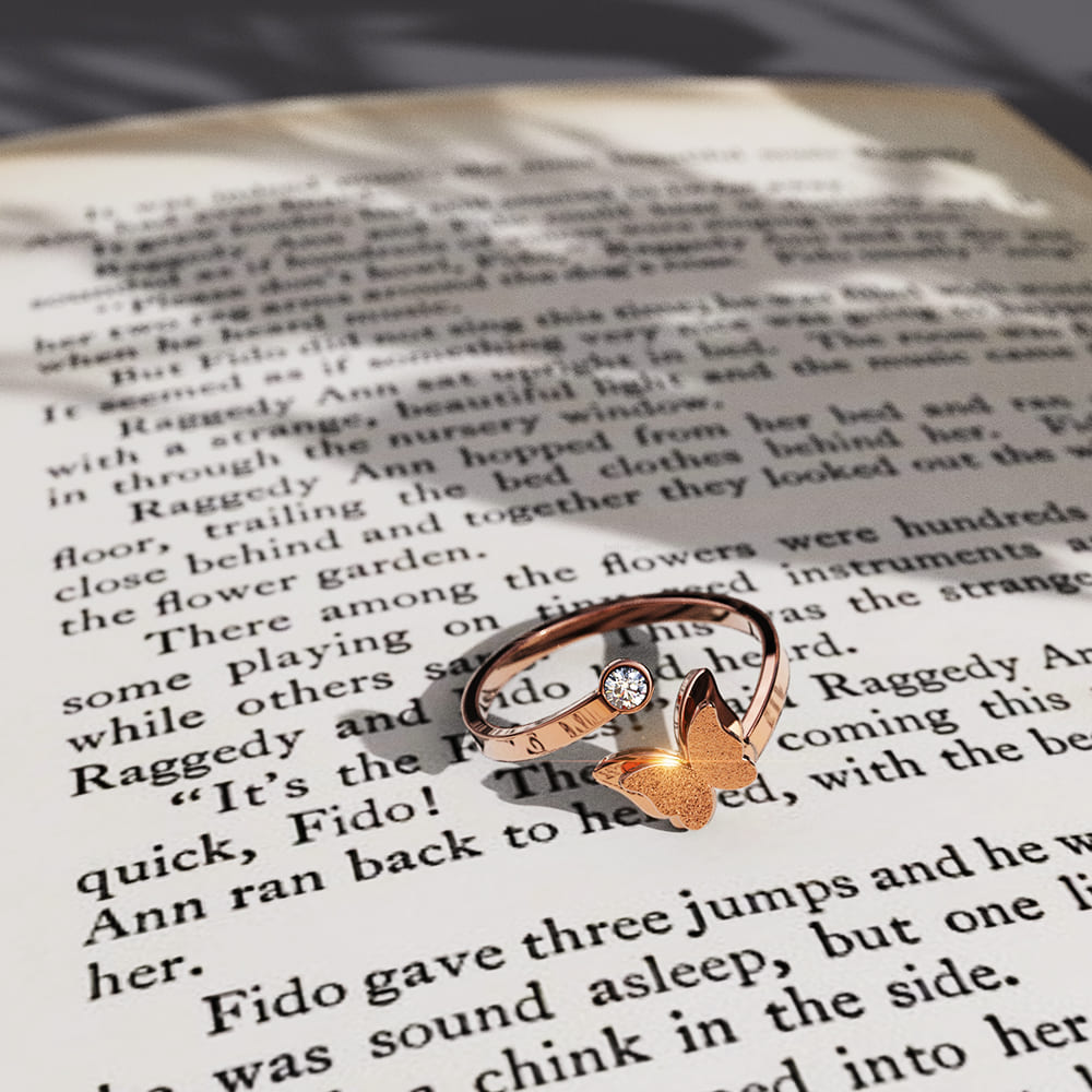 Step out in style with the brand new Mimsy Rose Gold Glitter Textured Butterfly Ring. Featuring your favorite combination of glitter with high polished rose gold plated stainless steel, this beautiful and simple piece of jewelry is a true wardrobe staple that can be worn everyday. Wear it alone or stack them up with your favorite rings for an edgier look.