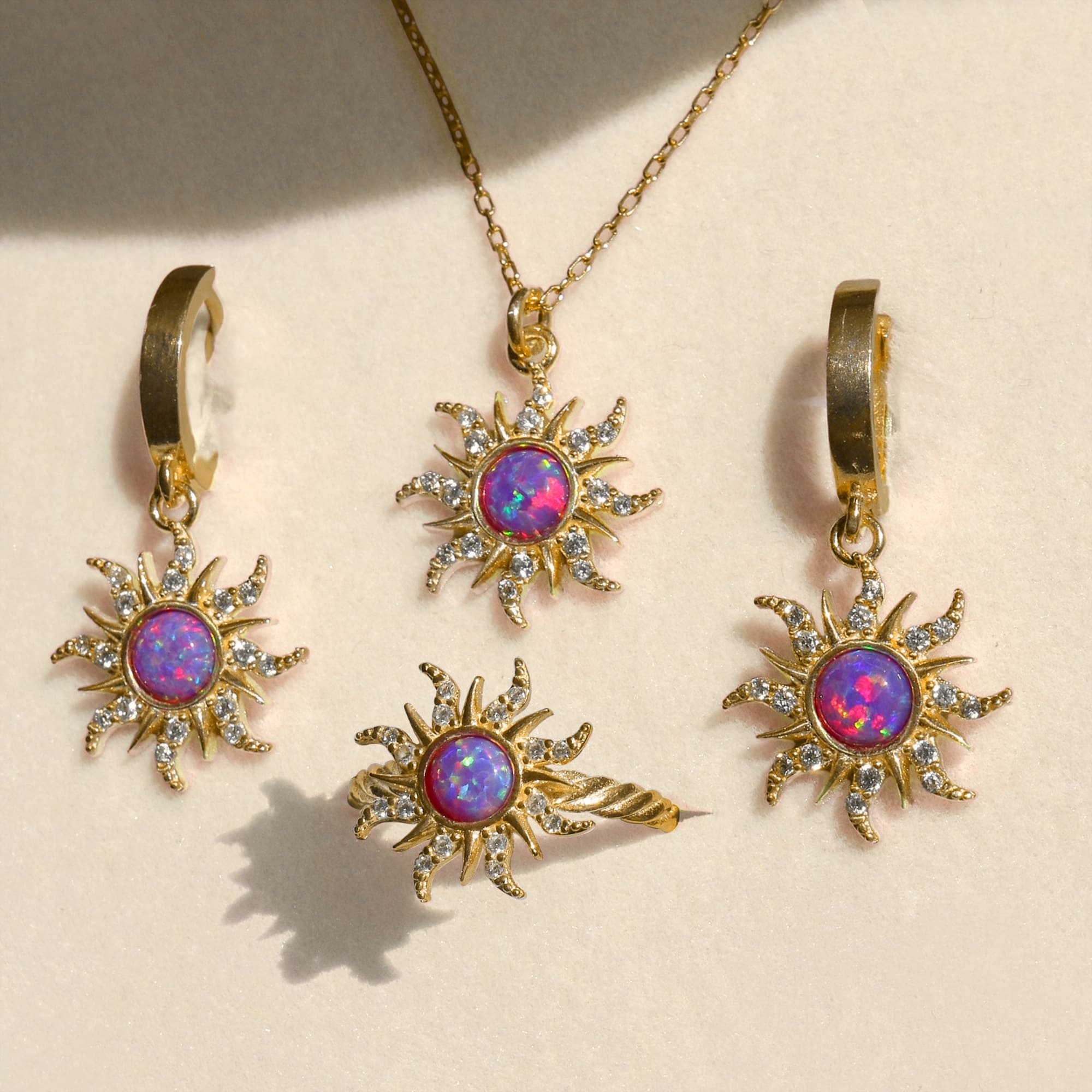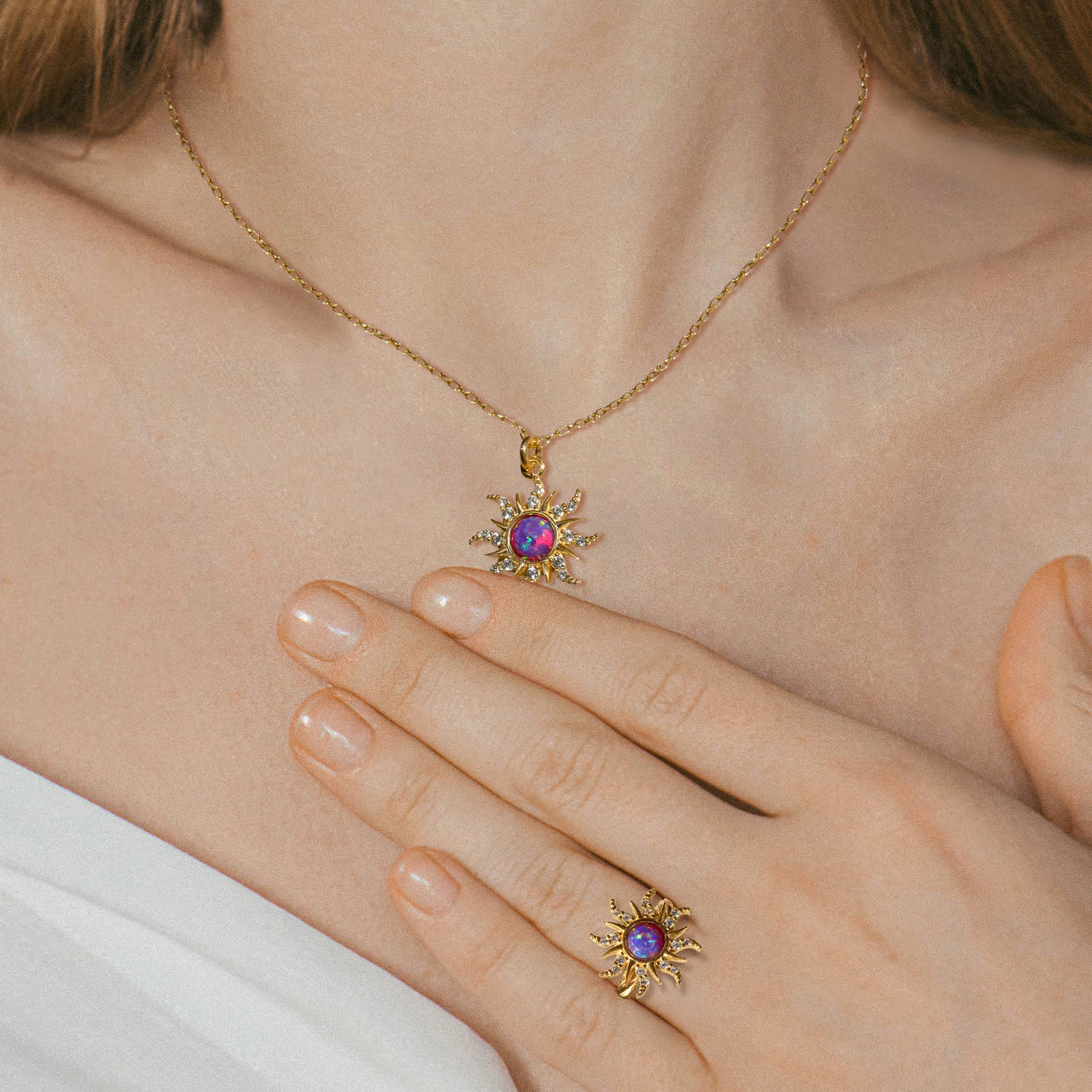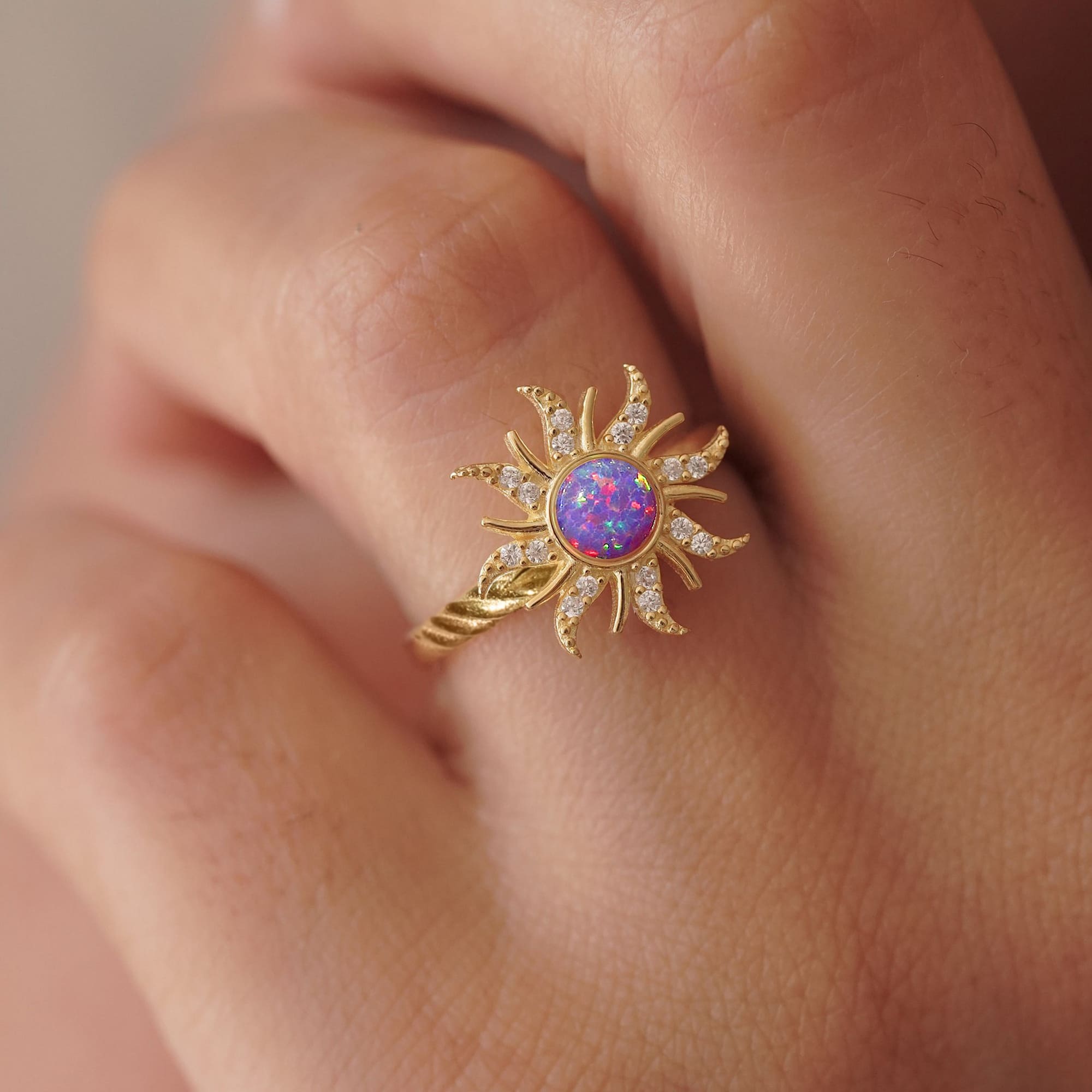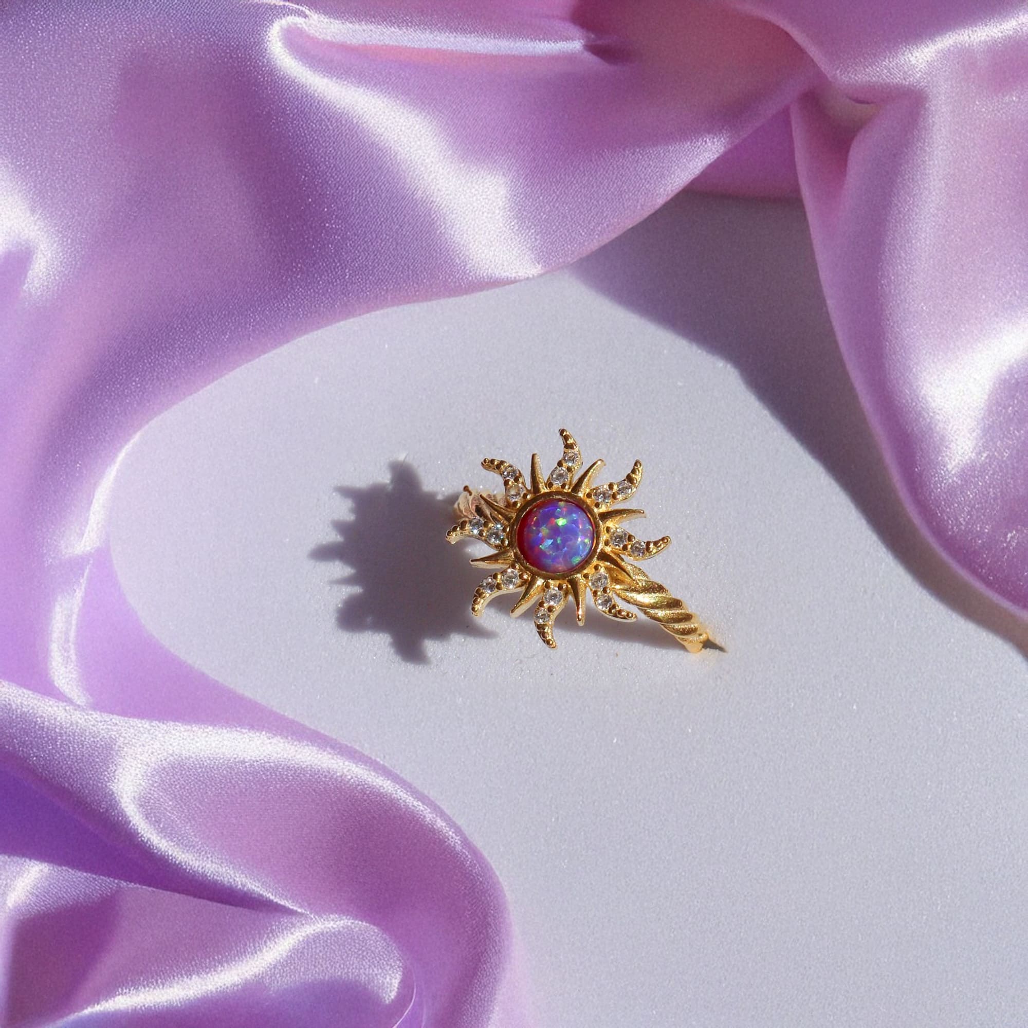 Embrace your inner glow with the Rapunzel Opal Sun Ring. This radiant piece features a luminous purple opal at its centre, framed by a sunburst design that symbolises warmth and light. A touch of whimsy and elegance, this ring is perfect for those who want to shine every day.