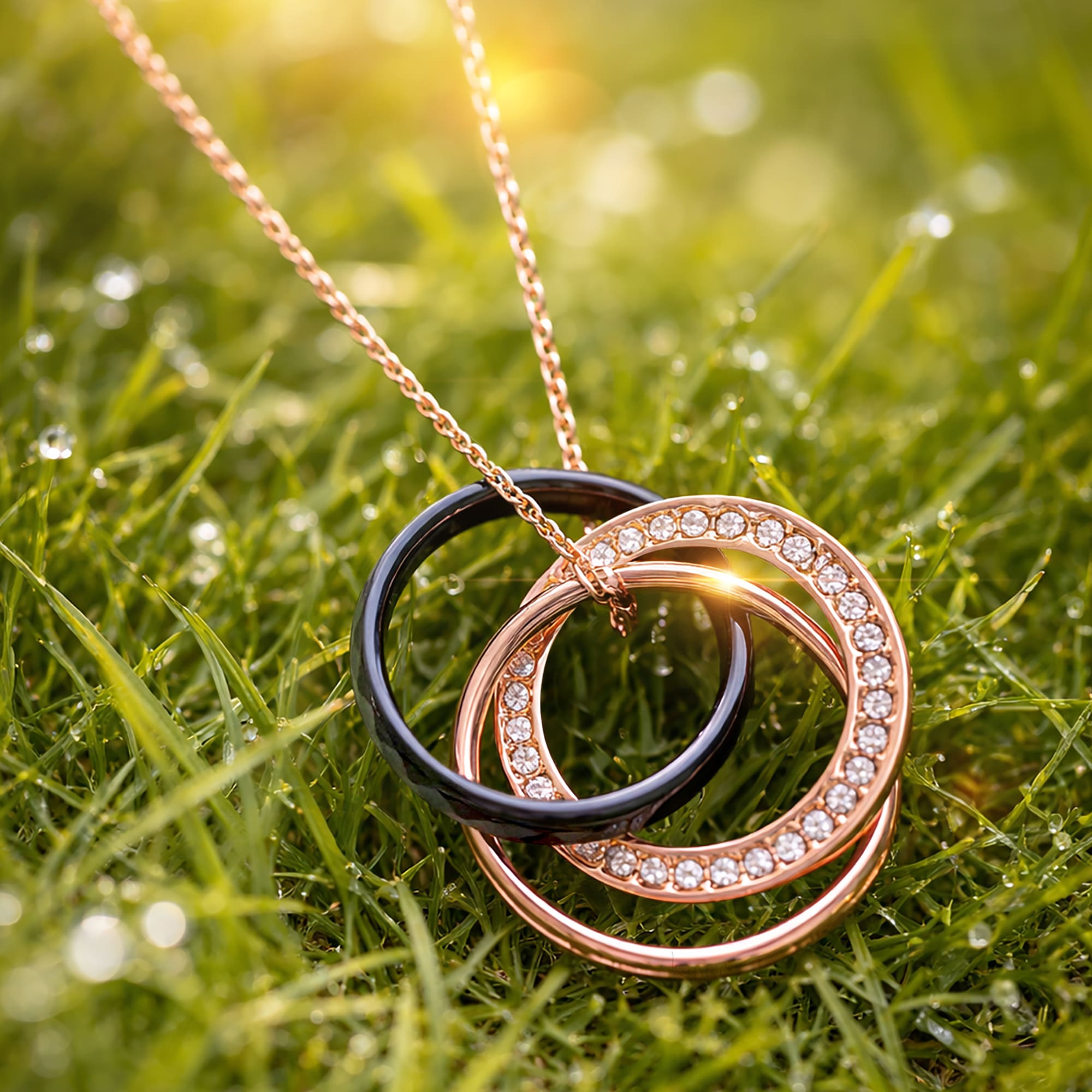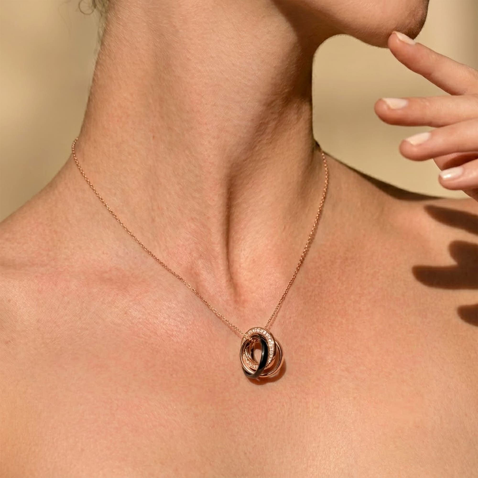 Rose Gold Triple Interlocking Ring Black Pendant Necklace Embellished with SWAROVSKI® Crystals