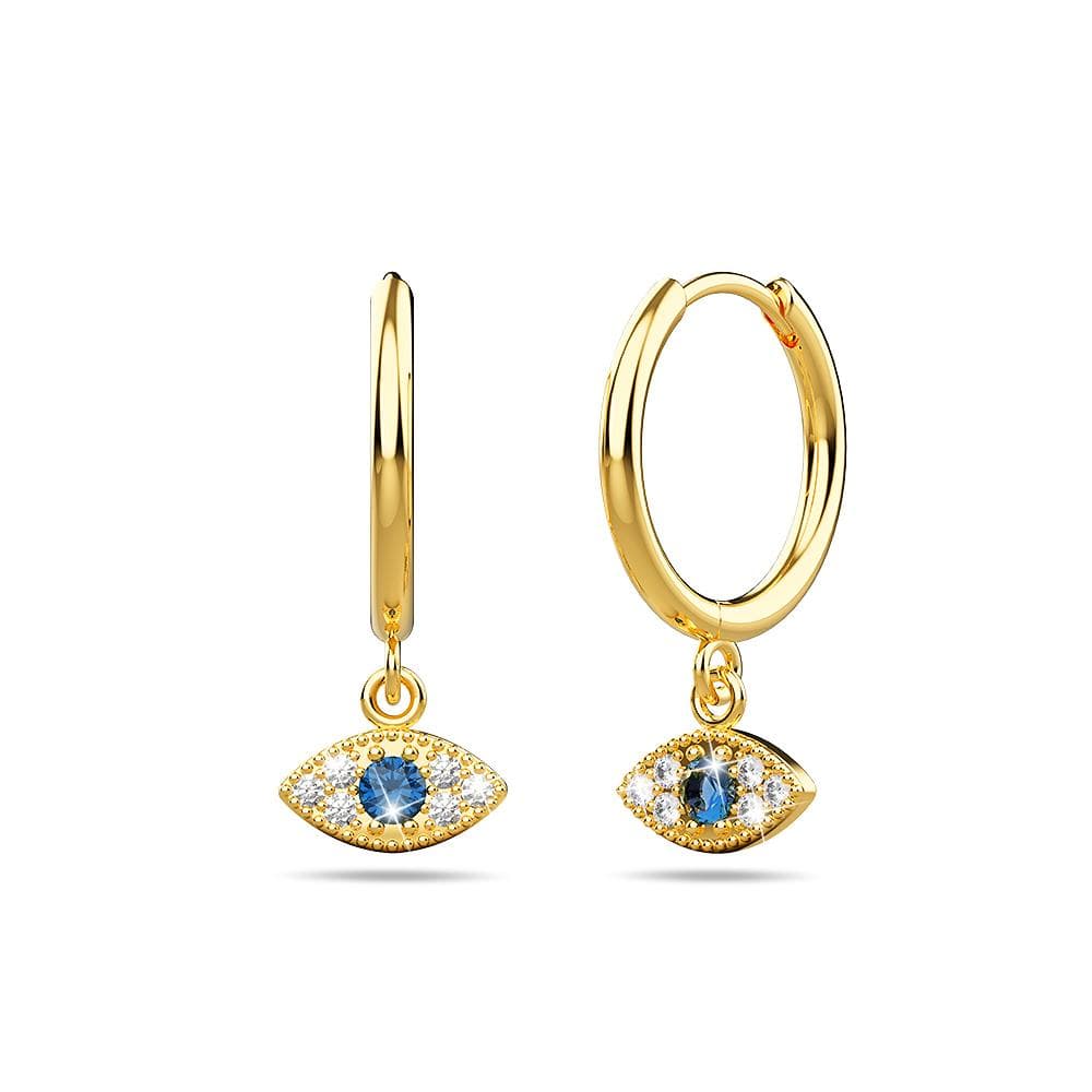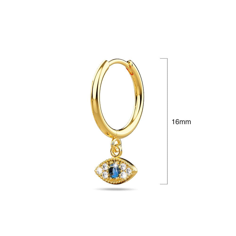 These beauties look too good to be true. The Evil Eye Huggie Earrings are a stunner featuring a centre cubic zirconia on its Gold plated silver, with an elegant twist at the end. They make the perfect gift for that special someone or a great addition to any collection.The Evil Eye Huggie earrings feature a unique teardrop shape that brings a playful modern feel to an age-old accessory. Perfect for spring, this piece is great for pairing with printed maxi dresses and strappy heels.